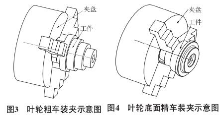 該葉輪分4次裝夾,毛坯選用圓柱棒料,第1次裝夾采用三爪夾盤(pán)夾持,完成葉輪打孔和粗車;第2次裝夾采用
