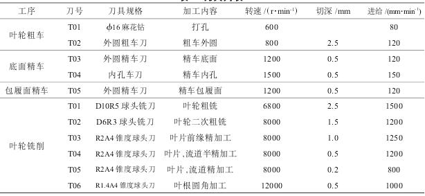 三爪夾盤(pán)夾持,完成葉輪底面臺(tái)階圓、臺(tái)階孔精車;第3次裝夾采用三爪夾盤(pán)和軟爪夾持,完成葉輪孔和輪轂的精車;第4次裝夾采用專用夾具夾持,完成葉輪銑削加工。工藝路線制定如下:1)備料。0Cr17Ni4Cu4Nb棒料,尺寸為220 mm×95 mm。2)打孔。在數(shù)控車床上用三爪夾盤(pán)夾持,打孔直徑為16 mm,深度貫通。3)粗車。粗車葉輪輪轂面,留2 mm精車余量。4)精車葉輪底面。在數(shù)控車床上零件掉頭,用三爪夾盤(pán)夾持,精車葉輪底面臺(tái)階外圓和臺(tái)階孔。5)精車葉輪包履面。在數(shù)控車床上用三爪夾盤(pán)和軟爪夾持。葉輪底面臺(tái)階外圓,精車內(nèi)孔和輪轂面。6)葉輪粗銑。在五軸聯(lián)動(dòng)加工中心上用專用夾具夾持,粗銑葉輪,流道方向和葉片方向各留0.5 mm精銑余量。7)粗銑葉片前緣。粗銑葉片前緣,留0.5mm精銑余量。8)葉片半精加工。半精加工葉片,葉片方向留0.2 mm精銑余量,流道方向留0.5 mm精銑余量。9)流道半精加工。半精加工流道,流道方向留0.2 mm精銑余量,葉片方向留0.5 mm精銑余量。10)葉片精加工。精加工葉片至零件圖樣要求。11)流道精加工。精加工流道至零件圖樣要求。12)葉根圓角精加工。精加工葉根圓角至零件圖樣要求。
