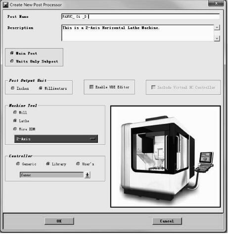 (2)新建一個(gè)后處理。在新建后置處理“Creat New Post Processor”對(duì)話 框 中 ,Post Name 為 FANUC_ 0i _D,輸出單位“Post Output Unit”設(shè)置為米制,機(jī)床類(lèi)型選擇 Lathe(車(chē)床),機(jī)床控制系統(tǒng)從Library中選擇FANUC,如圖2所示,控制系統(tǒng)的選擇非常重要,一定要正確選擇所用數(shù)控系統(tǒng)。