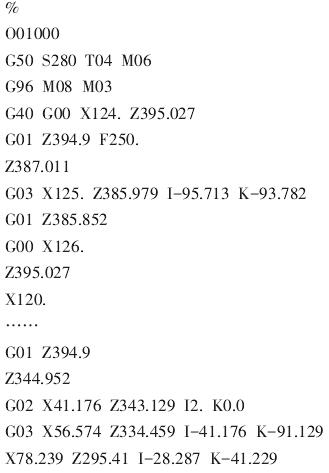 (6)定義數(shù)控程序加工過(guò)程程序段。程序加工過(guò)程中常用到的直線插補(bǔ) G01,圓弧插補(bǔ)G02\G03等,不再贅述,如圖6所示。